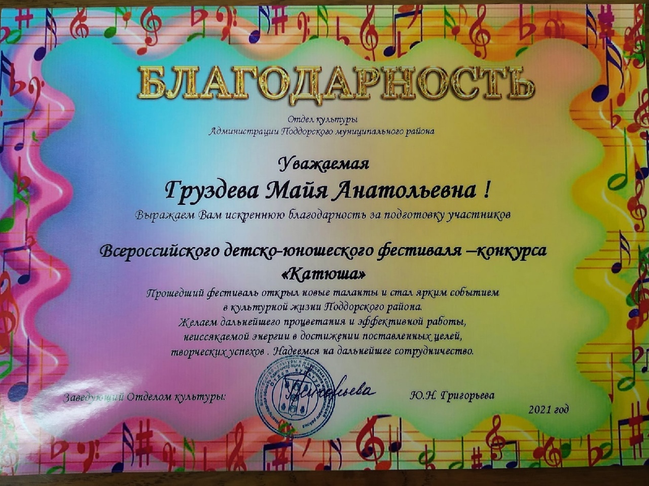 Все руководители Всероссийского фестиваля- конкурса « Катюша» отмечены благодарственными письмами оргкомитета.