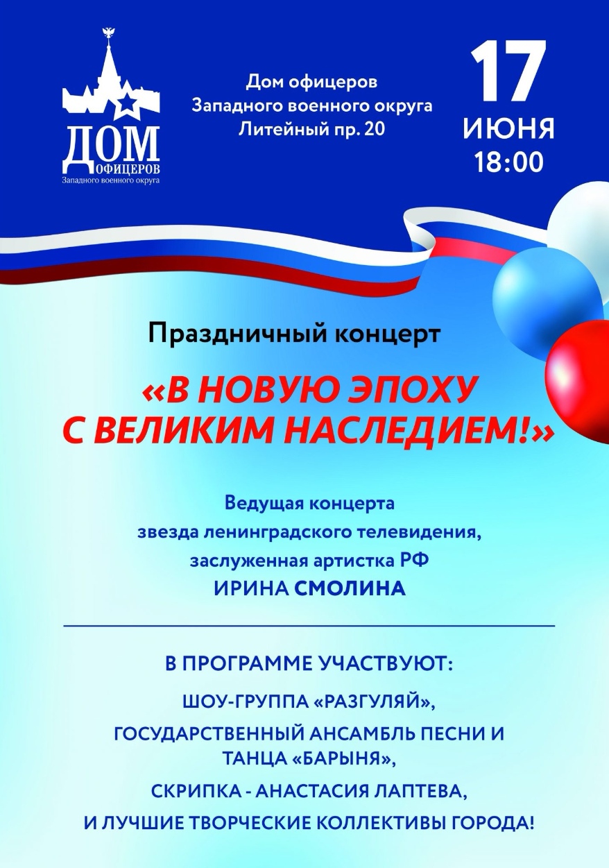 17 июня в Доме Офицеров города Санкт-Петербург состоялось торжественное мероприятие, посвященное Дню России. Ведущая программы заслуженная артистка России Ирина Смолина. В концерте принимали участие известные артисты Петербурга. В составе ансамбля Либерканто приняли участие сотрудники нашего центра Карпов Александр и Матвеева Виктория. Праздник прошел на высоком уровне, артисты получали бурные продолжительные аплодисменты за каждое выступление.